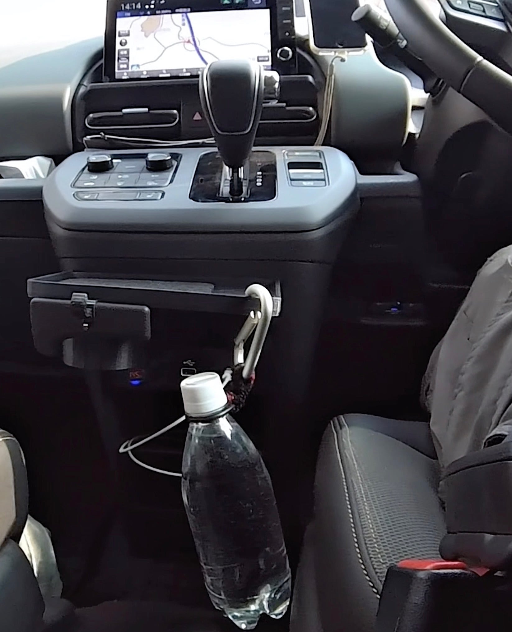 右側に支持のない片持ちですがドリンクホルダーに掛けたツメとスポンジテープを貼った背面とパネルがしっかり密着してガタつくこともありません。負荷テストであえて右端に500mlペットボトルをぶら下げ走行でもテーブルが外れたり大きく曲がるなどはありません。